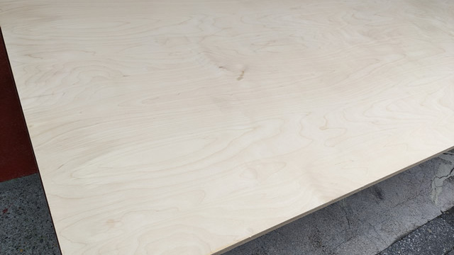 同じ厚みの単板を積層している縞模様の断面が特徴的です。100%植林木を使用し、FSC認証並びにPEFC認証材です。硬質で木目が詰まっていて、比重0.7で心材辺材の色差が少ない美しい合板です。淡白色で、かつ強度もあります。フィンランド産と違い、木目が長手方向に流れているので、普通合板と同じように使えます。裏面は補修パッチ箇所がある場合があります。耐水性のある接着剤を使用しているので、水にも強いです。フィンランドバーチ合板の品薄が続いているため、代替え材としても定着してきました。
